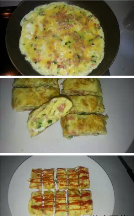两个鸡蛋、黄瓜碎、火腿碎、花椒粉、盐、香油搅拌在一起,平底锅小火摊成一个饼片,不翻面、待蛋液快要全部凝固的时候把蛋饼卷起来,装盘切段淋上番茄沙司!完成!
