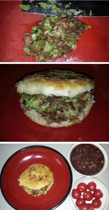 超市买的烧饼早晨起来平底锅热一下,头天吃剩的炖牛肉和生菜一起剁碎,把肉末加到烧饼里即可!一碗黑米粥外加一份圣女果!爱吃肉的一口都没剩下!早点摊上、饭店里肯定不会用放心肉的,所以宝贝爱吃肉的话还是自己在家做比较放心。