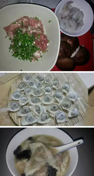 猪肉、鲜虾、香菇做馅,包好的馄饨冻在冰箱里,吃的时候拿出来直接煮就可以了!出锅前放几片紫菜,点几滴香油,汤比较好喝!再加一份水果沙拉,营养也算均衡了!