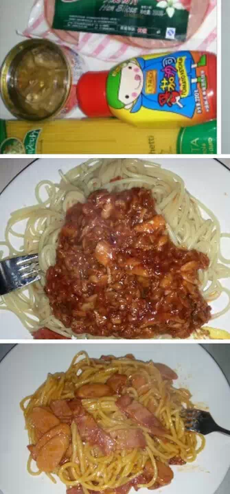 大部分孩子都喜欢吃意大利面,因为配面吃的酱是酸甜口味的!孩子也不例外!意大利面煮熟捞出,番茄沙司、培根片、猪肉馅、少量盐、均匀炒熟倒在煮好的意大利面上即可!搭配一杯热牛奶!因为面做的有点儿多,就没在加水果!需要注意的就是一定要用吃薯条的番茄沙司,而非做蛋花汤用的普通番茄酱!两个酱的口味做出来天壤之别呦!