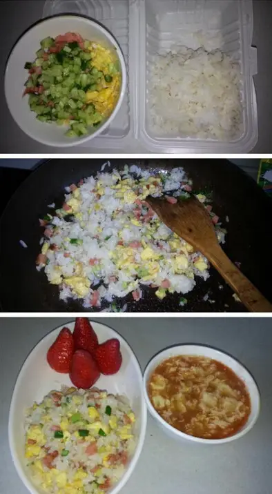 剩米饭、黄瓜丁、火腿丁、鸡蛋碎、葱末一起翻炒、最后用盐、香油调味出锅,外加一碗番茄鸡蛋汤和四颗草莓,宝贝吃的干干净净!早晨如果不想起太早,头天晚上可以把黄瓜火腿都切好,鸡蛋炒好,早晨起来简单一炒就ok了!