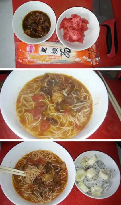 头天晚上剩下的炖牛肉当汤头,西红柿炝锅,炖牛肉和挂面一起下锅煮,盐、鸡精、香油、调味出锅,外加香蕉火龙果沙拉!宝贝吃的盆干碗儿净!
