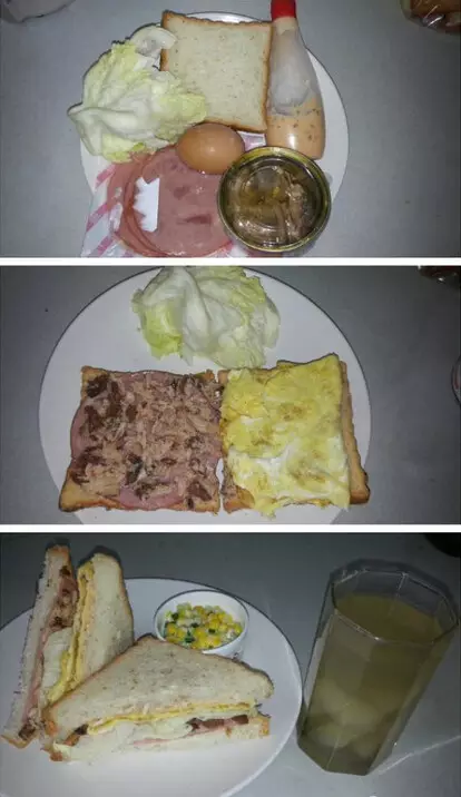 两片土司、金枪鱼罐头、火腿切片、煎鸡蛋片、生菜、千岛酱、全部加在一起,对角切开即可!煮熟的甜玉米和黄瓜丁用沙拉酱拌匀即可!雪花梨跟冰糖一起煮成梨汤即可!这款早餐看起来很费时间,微信武了个汉其实可以头天晚上一一准备好的!