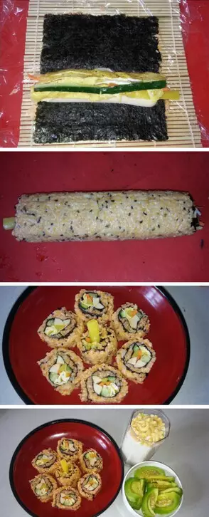 鱼子酱、黑芝麻、盐跟温热的米饭一起拌匀,均匀的铺在紫菜上压实,把米饭翻过去紫菜朝上,黄瓜条、甜萝卜、鸡蛋皮、火腿肠、金枪鱼、一起码放在紫菜上,淋少许千岛酱卷起来切段即可!搭配一份甜瓜和一杯牛奶脆谷乐!营养又好吃,非常简单呢!