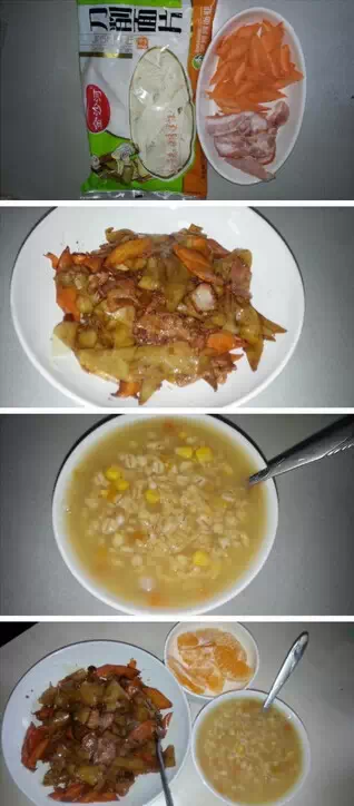 超市买的干面片,煮熟后捞出备用,培根片爆香、胡萝卜片、面片、黄豆酱、均匀炒熟后点香油出锅!搭配一碗玉米燕麦杂粮粥和一份非常败火的丑桔!孩子就剩了几口粥,其他的统统干掉!